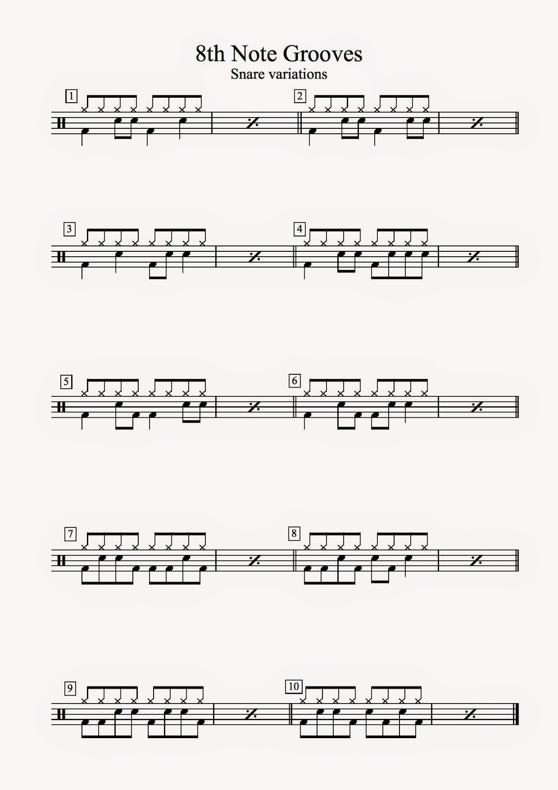 The one step in Reggae is played with the bass drum on the third beat. Above are some examples of one step grooves with variations on the snare drum. A lot of Reggae is played in a shuffled style, so try playing each groove as a shuffle as well as a straight 1/4 note groove.Also try to remember that Reggae is a very chilled, laid back style of music, so some of the later grooves would be more likely used as fills instead of the main groove.If you're fairly confident with these grooves give them a go along with some Reggae tunes.Have fun!